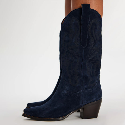 Navy Blue Faux Suede Snip-Toe Classic Embroidery Mid Calf Cowgirl Boots