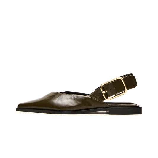 Olive Green Vegan Leather Pointed-Toe Slingback Buckle Flats