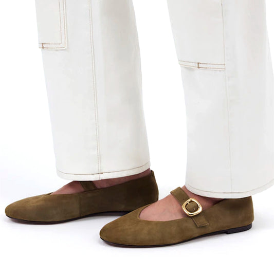 Olive Green Faux Suede Round-Toe Buckle Bridge Strap Slip-On Flats