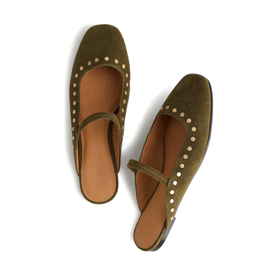 Olive Green Faux Suede Square-Toe Bridge Strap Studded Slip-On Flats