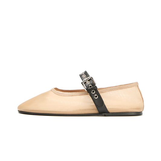 Nude Mesh Round-Toe Ballet Flats With Bridge Strap