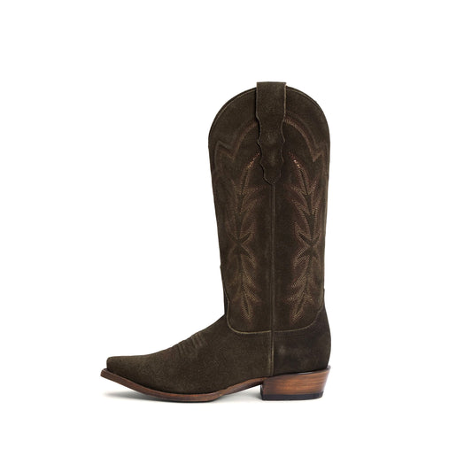Olive Green Faux Suede Snip-Toe Embroidery Half-Zip Knee High Cowgirl Boots