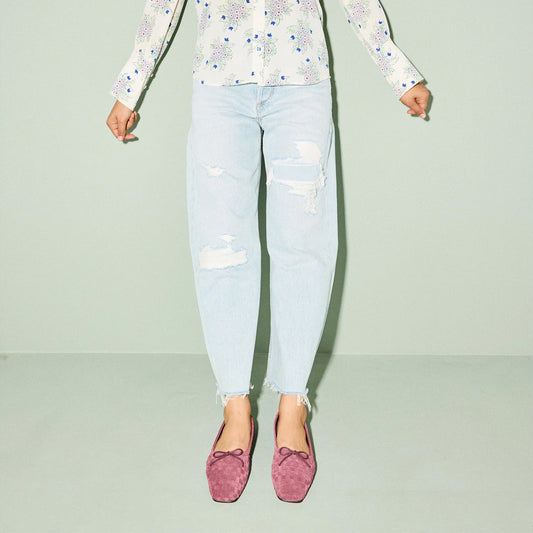 Wine Red Woven Faux Suede Square-Toe Front Bow Ballet Flats
