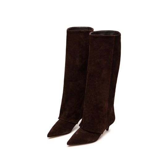 Brown Faux Suede Pointed-Toe Tall Fold-Over Wide Calf Knee High Stiletto Boots