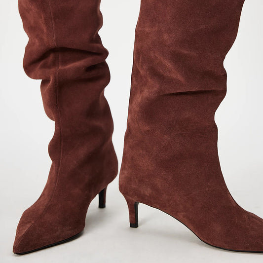 Coffee Faux Suede Pointed-Toe Wide Calf Knee High Stiletto Boots