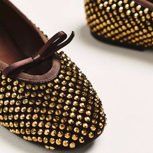 Cocoa Velvet Round-Toe Center Studded Bow Slip-on Ballet Flats