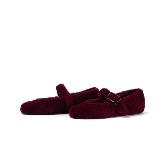 Cherry Red Full Plush Square-Toe Bridge Strap Ballet Flats