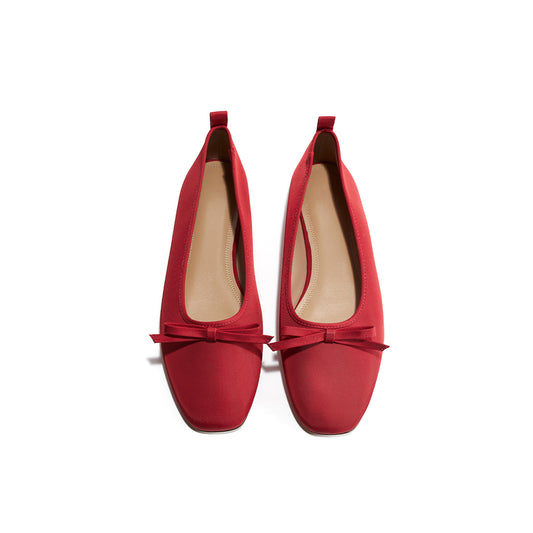 Red Satin Square-Toe Classic Ballet Flats With Front Bow
