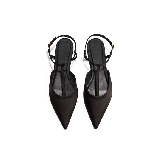 Black Satin Pointed-Toe Ankle Slingback Flats
