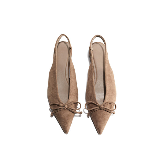 Beige Faux Suede Pointed-Toe Front Bow Slingback Flats
