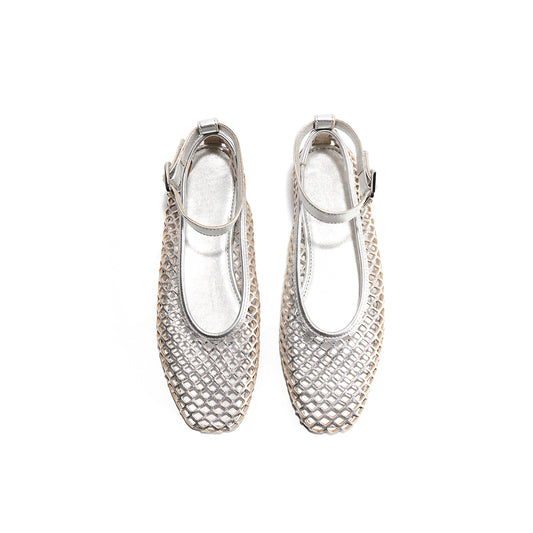 Silver Mesh Round-Toe Floral Embroidery Ballet Flats