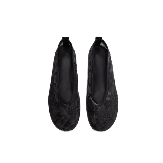 Black Mesh Round-Toe Floral Embroidery Ballet Flats