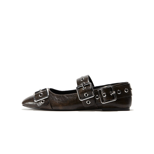 Dark Brown Square-Toe Eyelet Straps Ballet Flats