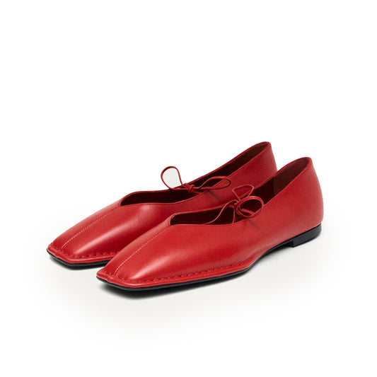 Red Square-Toe V-Cut Vamps Bridge Self-Tie Bow Ballet Flats