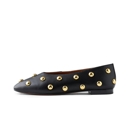 Black Vegan Leather Studded Square-Toe Ballet Flats