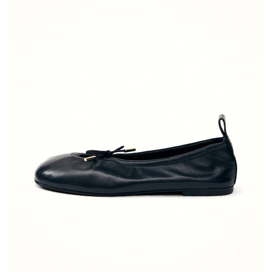 Black Square-Toe V-Cut Vamps Bridge Self-Tie Bow Ballet Flats