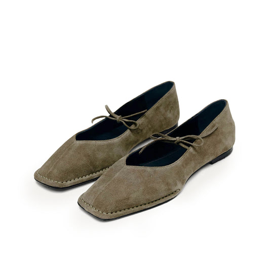 Khaki Faux Suede Square-Toe V-Cut Vamps Bridge Self-Tie Bow Ballet Flats