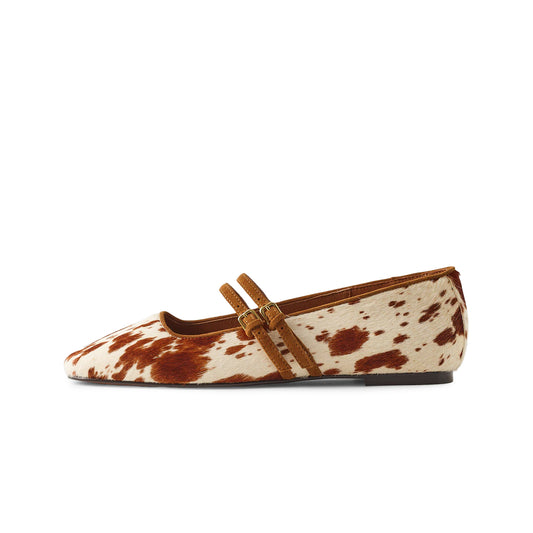 Cow Print Pony Hair Square-Toe Double Buckle Bridge Strap Flats