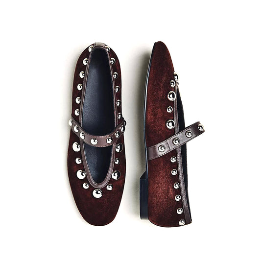 Brown Faux Suede Square-Toe Studded Bridge Strap Flats