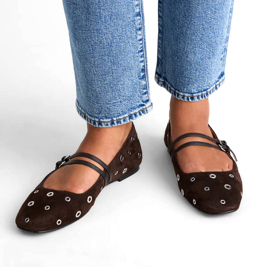 Cocoa Faux Suede Square-Toe Eyelet Double Buckle Bridge Strap Flats