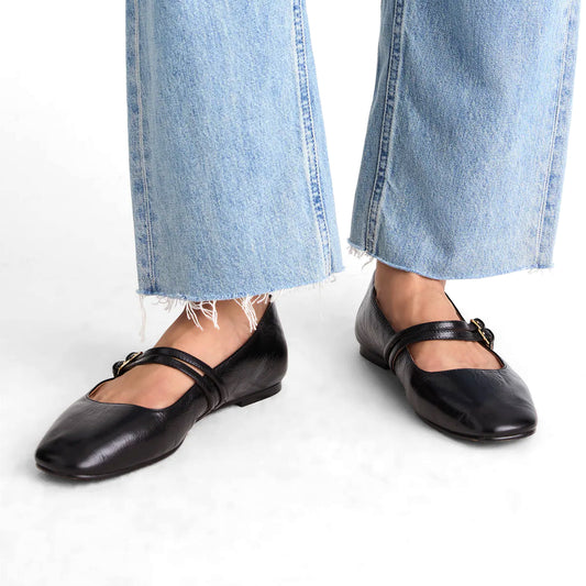Black Square-Toe Double Buckle Bridge Strap Flats