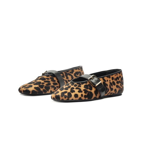 Leopard Pony Hair Round-Toe Bridge Strap Buckle Flats