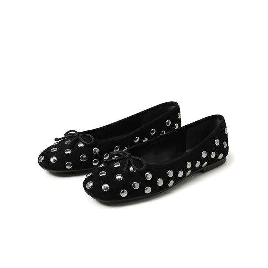 Black Faux Suede Square-Toe Studded Slip-On Flats
