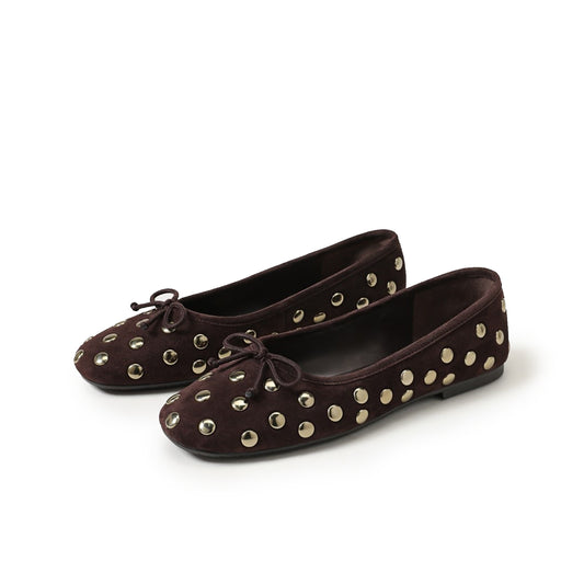 Coffee Faux Suede Square-Toe Studded Slip-On Flats
