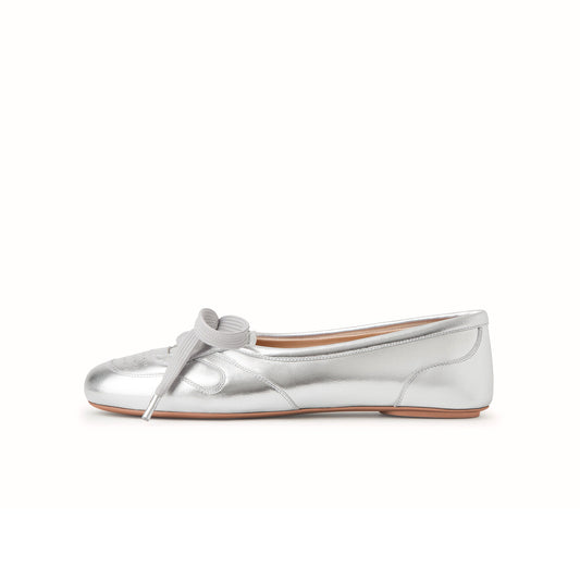 Metallic Silver Round-Toe Front Lace-Up Slip-On Ballet Flats