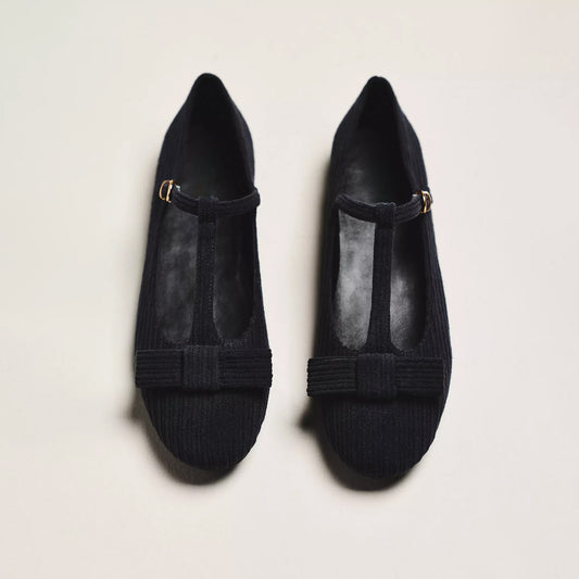 Black Striped Flannel Fabric Round-Toe T-Strap Ballet Flats