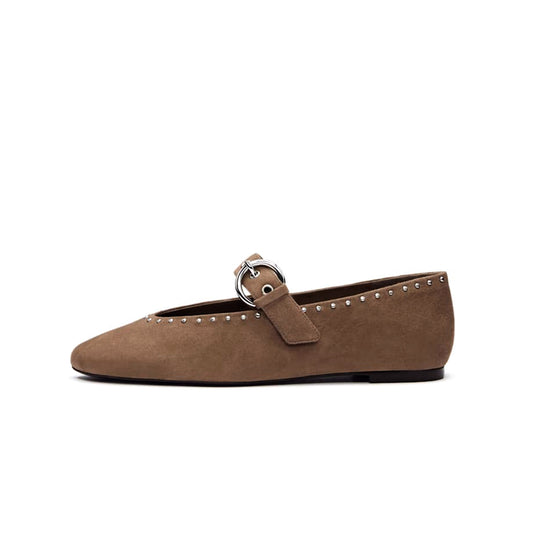 Brown Faux Suede Square-Toe Classic Buckle Bridge Strap Studs Ballet Flats