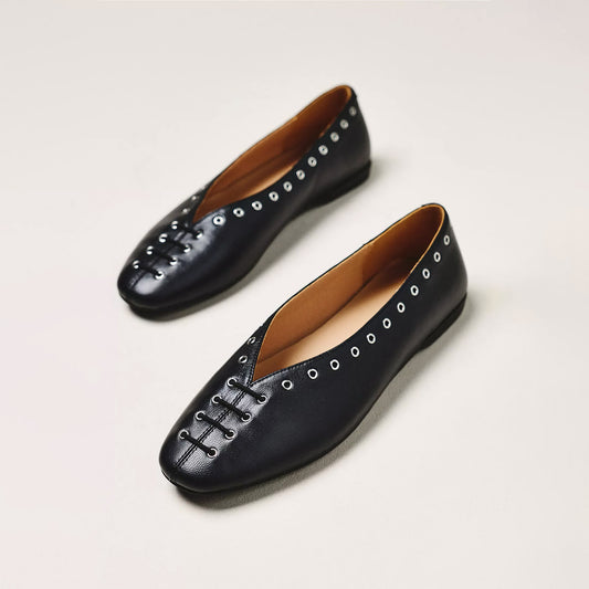 Black Square-Toe Grommet Lace-Up Ballet Flats