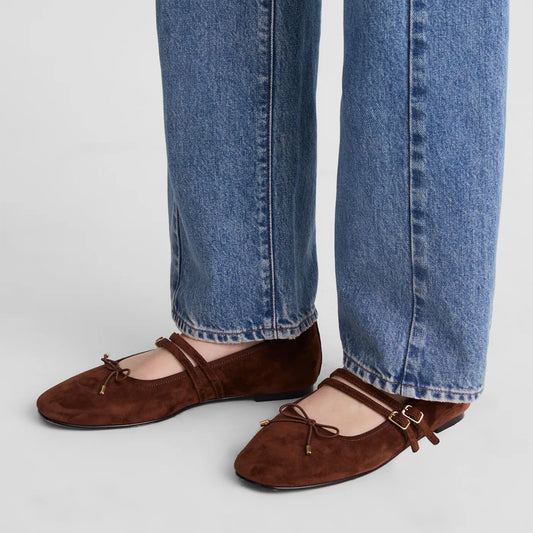 Mahogany Faux Suede Square-Toe Double Bridge Strap Front Bow Ballet Flats