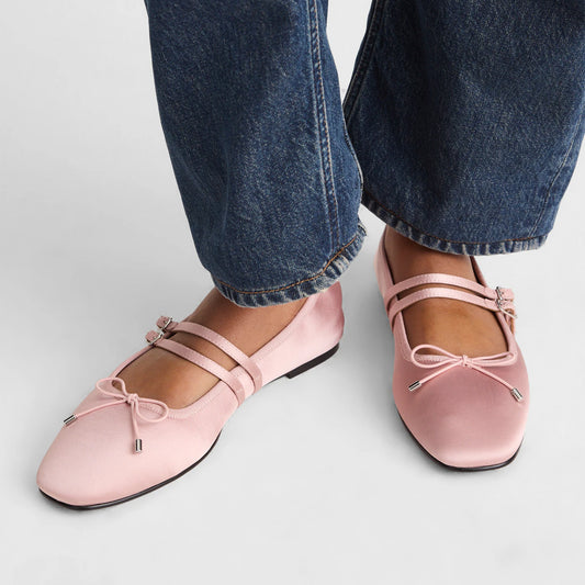 Blush Pink Satin Square-Toe Double Bridge Strap Front Bow Ballet Flats