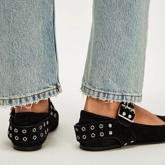 Black Suede Square-Toe Studded Adjustable Strap With Buckle Flats
