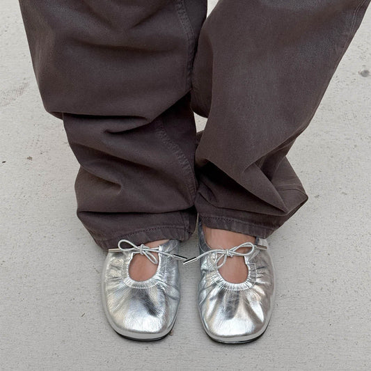 Metallic Sliver Square-Toe Bridge Self-Tie Bow Ballet Flats