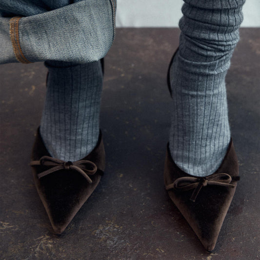 Brown Velvet Pointed-Toe Front Bow Slingback High Heels