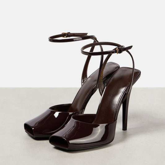 Patent Brown Square-Toe Ankle Strap High Heels