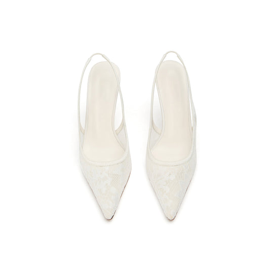 Ivory Lace Mesh Pointed-Toe Classic Satin Slingback High Heels