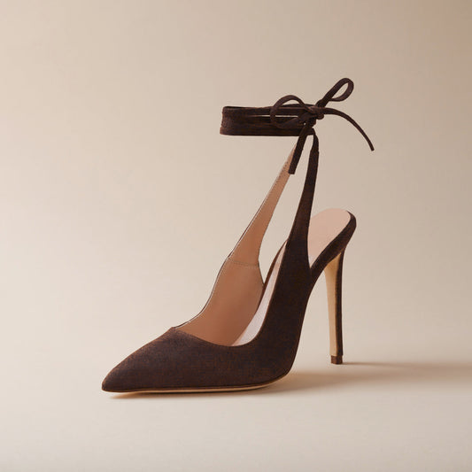 Brown Faux Suede Pointed-Toe Slingback Ankle Laces High Heels