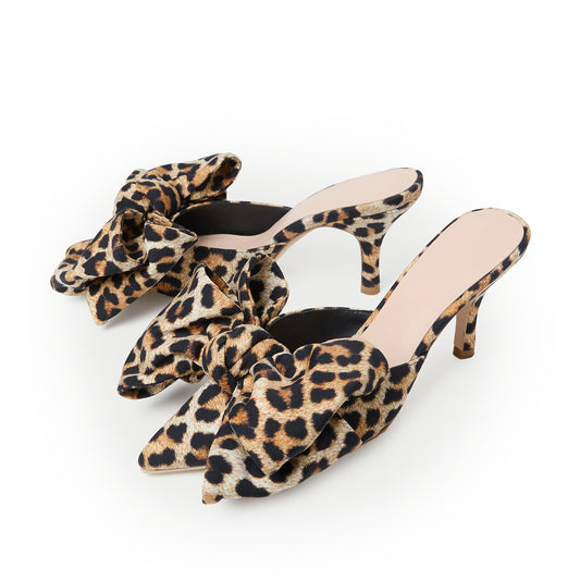 Leopard Satin Pointed-Toe Front Big Bow High Heels