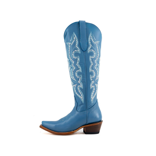 Blue Snip-Toe Rhinestone And Embroidery Half-Zip Knee High Cowgirl Boots