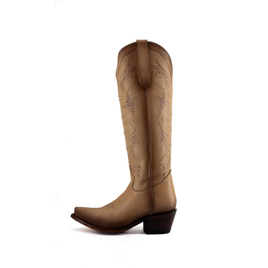 Latte Snip-Toe Rhinestone Embroidery Half-Zip Knee High Cowgirl Boots