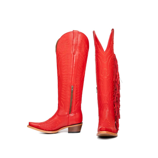 Red Snip-Toe Embroidery Side Fringe Half-Zip Knee High Cowgirl Boots