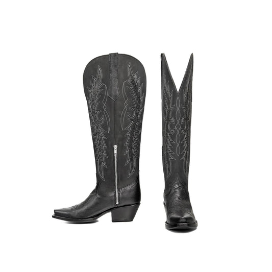 Black Snip-Toe Embroidery Side Fringe Half-Zip Knee High Cowgirl Boots