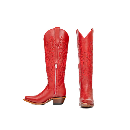 Red Snip-Toe Rhinestone And Embroidery Half-Zip Knee High Cowgirl Boots