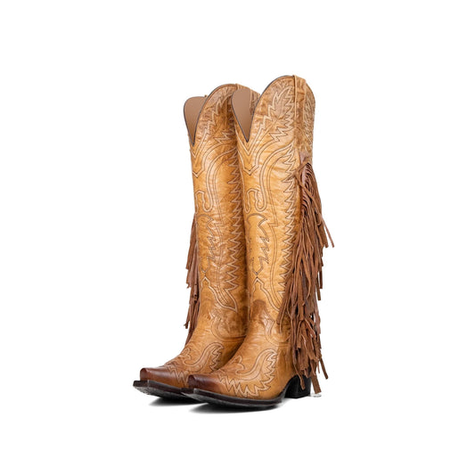 Camel Snip-Toe Embroidery Side Fringe Half-Zip Knee High Cowgirl Boots