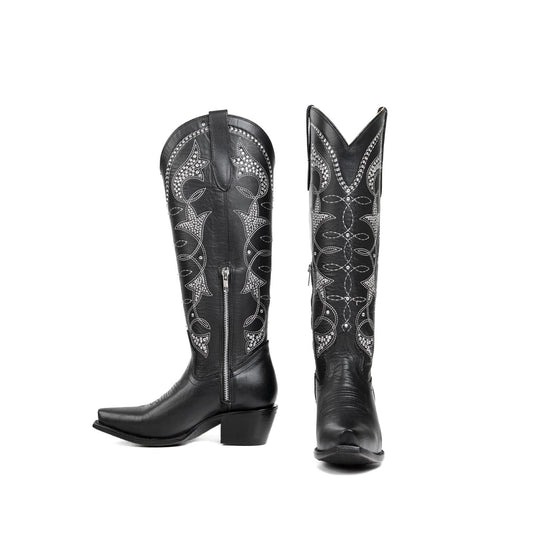 Black Snip-Toe Black Rhinestone Embroidery Half-Zip Knee High Cowgirl Boots