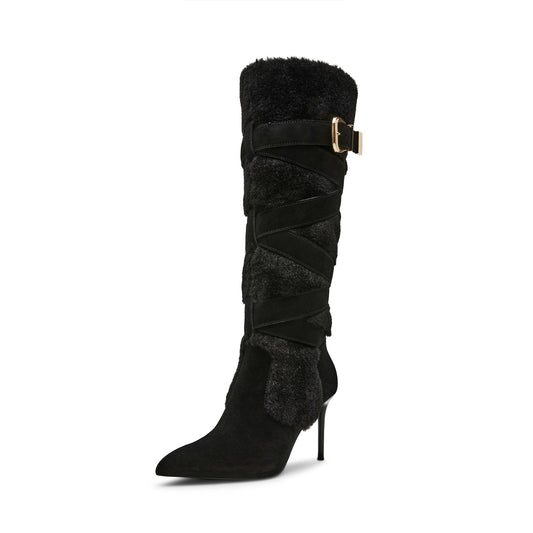 Black Faux Suede Contrast Plush Pointed-Toe Full-Zip Buckle Knee High Stiletto Boots