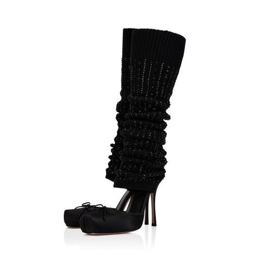 Black Satin Square-Toe Woolen Shaft With Rhinestone Knee High Stiletto Boots